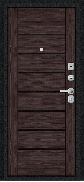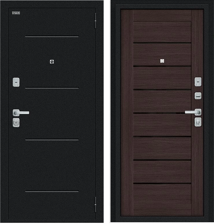 Надежная входная Дверь Браво Техно/BChrome Букле черное/Wenge Melinga премиум класса по цене 35 191 руб. Большая толщина стали защитит от проникновения в ваш дом, квартиру или коттедж. Используется очень качественная фурнитура: замки, цилиндры, ручки, защелки. Покрытие и отделка двери изготовлено под внимательным контролем производителя. Дверь имеет долгий срок службы и гарантию.